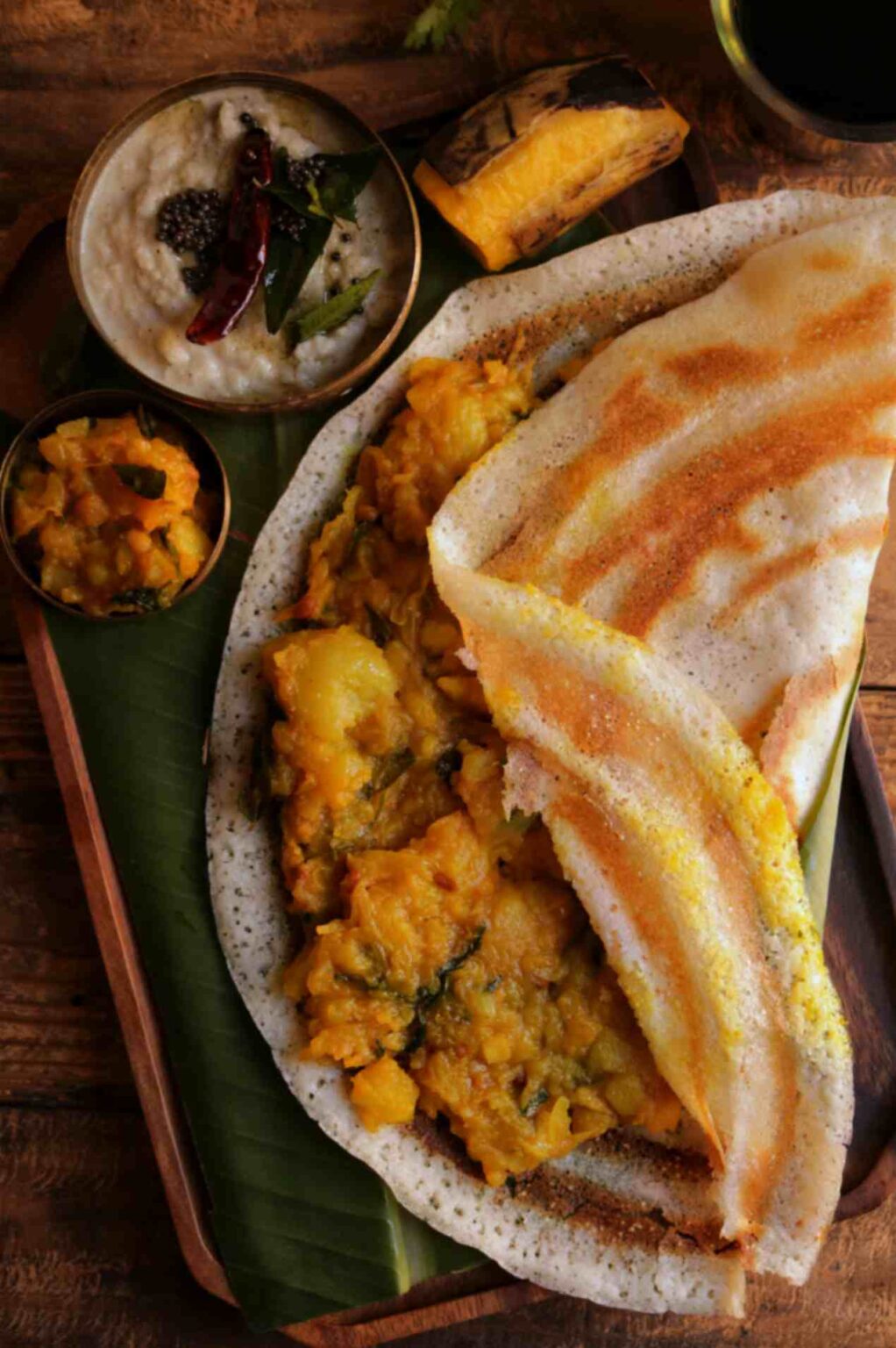 Crispy dosa with a spicy potato filling – a classic favorite! .